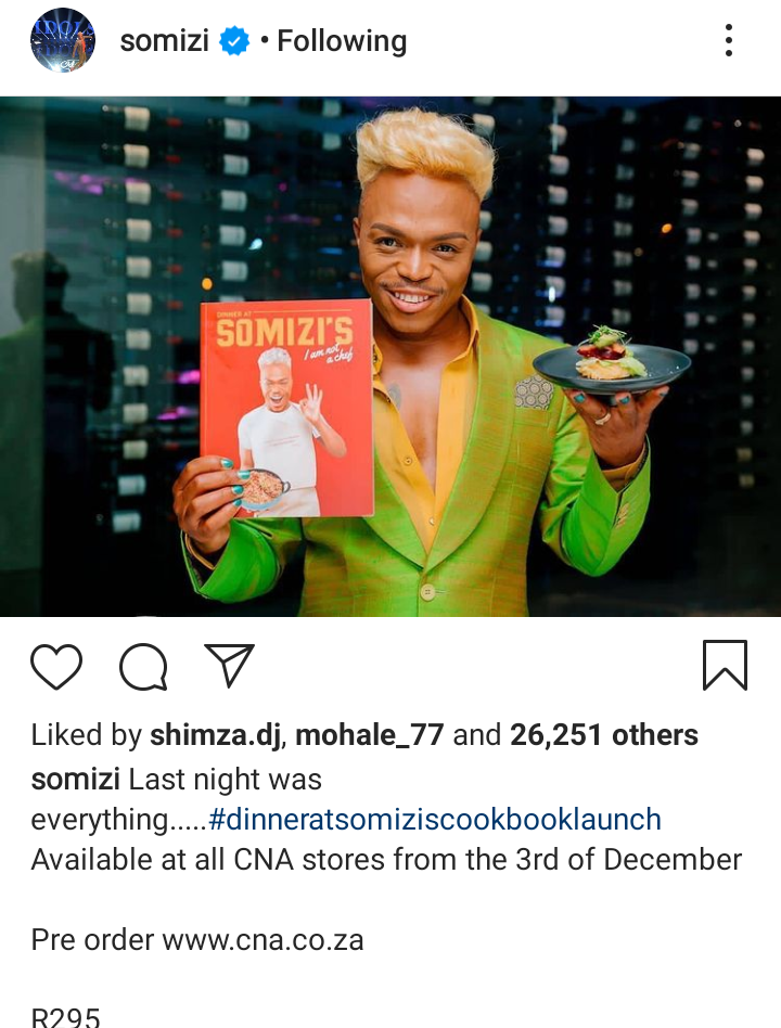 Few months after starting the cooking show, Somizi has just launched his own Cookbook called the Dinner at Somizi’s cookbook. The book is going to be made available at CNA stores starting on the third of December 2020.