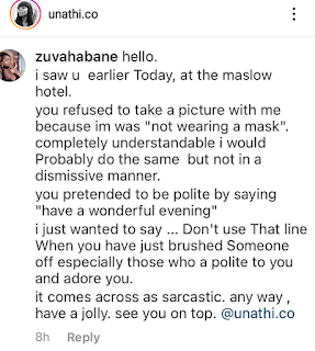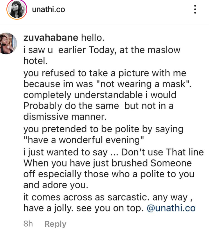 This did not sit well with the fan and she decided to take the matter to social media and confront Unathi about it and she even went as far as tagging Unathi on her status. The woman also expressed how Unathi refused to take a picture with her as she was not wearing a mask and she understands the reason for her being refused a picture. What the woman seems to not understand is why Unathi reacted in a very dismissive manner.