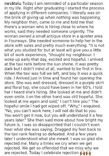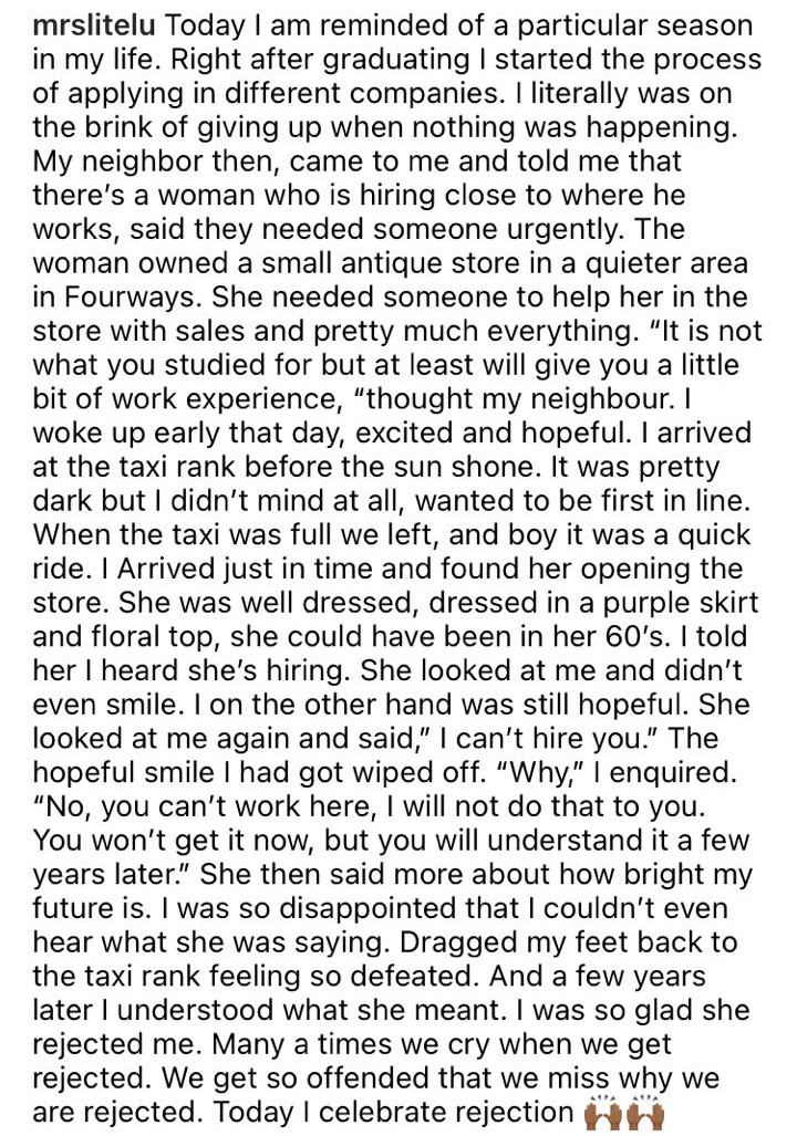 “Today I am reminded of a particular season in my life. Right after graduating I started the process of applying in different companies. I literally was on the brink of giving up when nothing was happening. My neighbor then, came to me and told me that there’s a woman who is hiring close to where he works, said they needed someone urgently. The woman owned a small antique store in a quieter area in Fourways. She needed someone to help her in the store with sales and pretty much everything. “It is not what you studied for but at least will give you a little bit of work experience, “thought my neighbour. I woke up early that day, excited and hopeful. I arrived at the taxi rank before the sun shone. It was pretty dark but I didn’t mind at all, wanted to be first in line. When the taxi was full we left, and boy it was a quick ride. I Arrived just in time and found her opening the store. She was well dressed, dressed in a purple skirt and floral top, she could have been in her 60’s. I told her I heard she’s hiring. She looked at me and didn’t even smile. I on the other hand was still hopeful. She looked at me again and said,” I can’t hire you.” The hopeful smile I had got wiped off. “Why,” I enquired. “No, you can’t work here, I will not do that to you. You won’t get it now, but you will understand it a few years later.” She then said more about how bright my future is. I was so disappointed that I couldn’t even hear what she was saying. Dragged my feet back to the taxi rank feeling so defeated. And a few years later I understood what she meant. I was so glad she rejected me. Many a times we cry when we get rejected. We get so offended that we miss why we are rejected. Today I celebrate rejection” , she said.