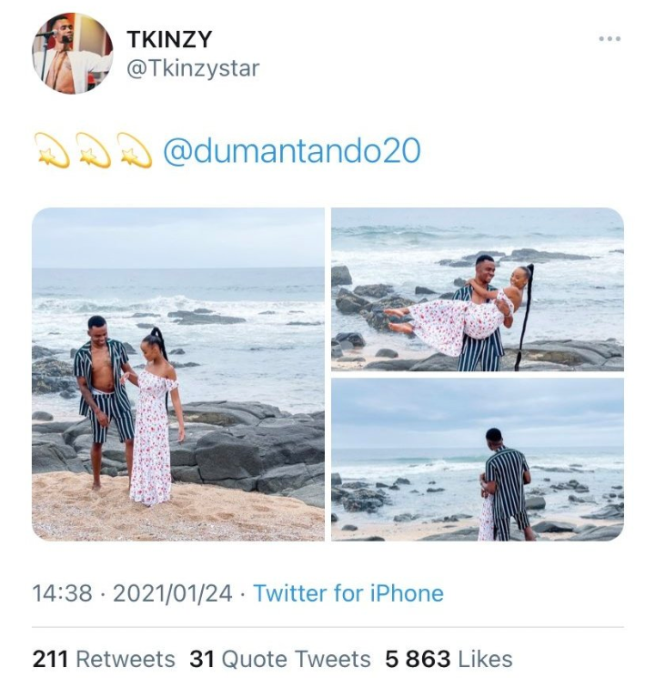 Recently, pictures where making rounds on social media that had people thinking that Duma Ntando has found herself a new man. The pictures even led to her biggest fans congratulating her on her new found relationship. The pictures where posted by a Nigerian singer called Anthony. The pictures where taken on the beach where Duma looked so happy with the man, which is why people started thinking that she might have found herself a new man.