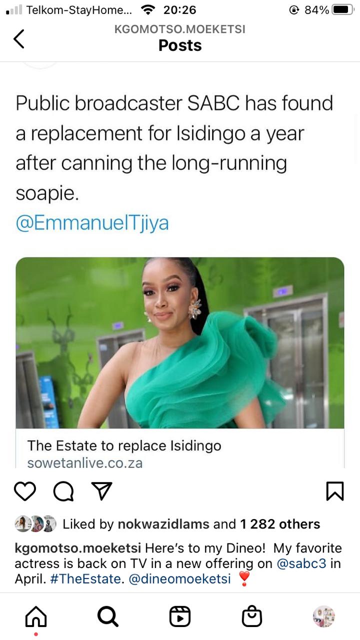 Here’s to my Dineo! My favorite actress is back on TV in a new offering on @sabc3 in April. #TheEstate. @dineomoeketsi ❣️